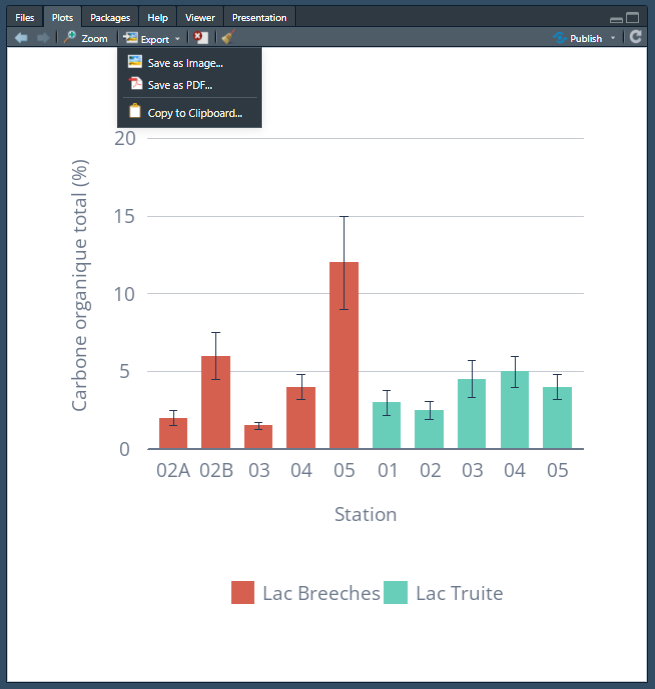 Pour exporter un graphique affiché dans le volet Plots de RStudio, suivez ces étapes :